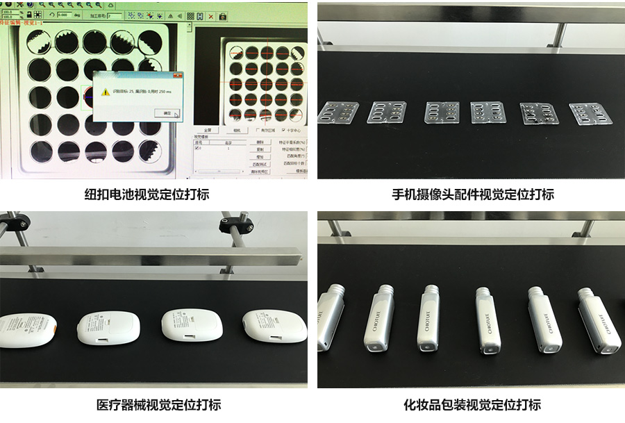 本技術運用了視覺定位原理,先對產品進行模板制定,保存為標準模板,在加工時對產品進行拍照,由計算機對比及位置定位,調整后即可對產品進行精確加工。所加工的產品外形可以是圓形、方形、非規則形狀都可以識別;這種工藝特別適合小產品,可免除定位料盤、固定夾具的加工,大大節省了激光打標加工周期??筛鶕嶋H產品工藝要求選配不同類型激光器。